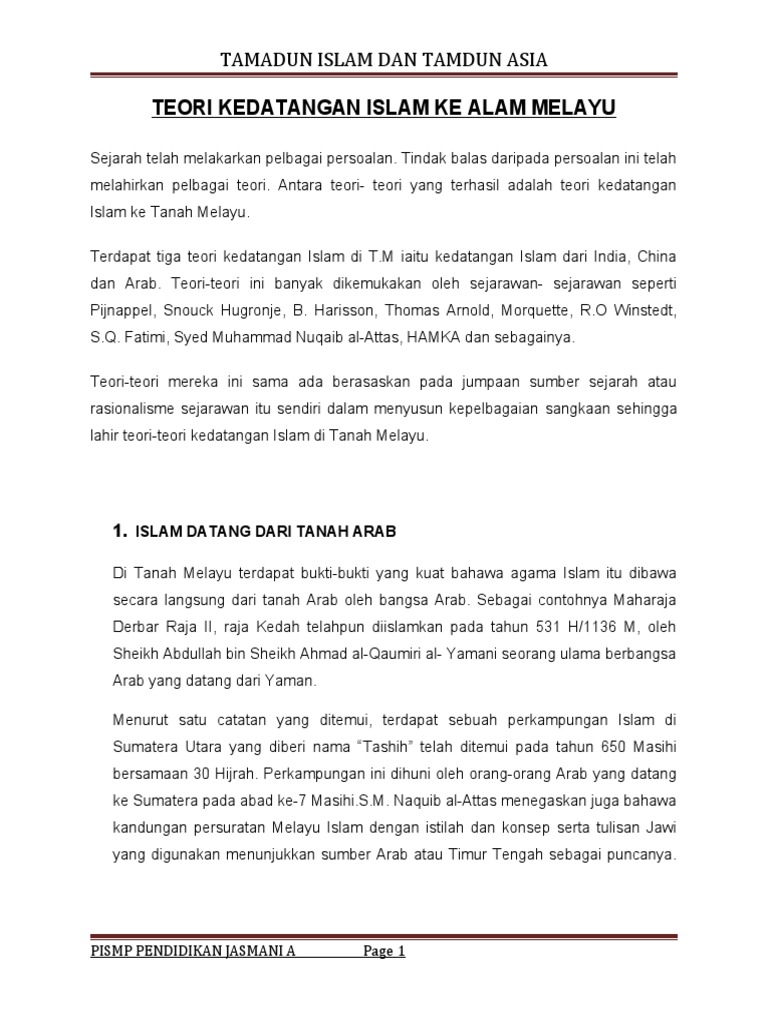 Sistem pemerintahan ini bermula dengan kesultanan melayu melaka sekitar tahun 1400 m yang kemudian. Kedah dikatakan antara negeri terawal yang menerima islam di tanah melayu. Di campa terdapat dua buah inskripsi yang menguatkan lagi dakwaan sesetengah ahli sejarah mengenai kedatangan islam itu dari champa. Salah satu sejarah konflik di masa islam klasik adalah tragedi mihnah. Pernah menjadi kontroversi suatu ketika dahulu. Akar melayu, kerajaan melayu islam terawal di nusantara, kesultanan majapahit, realitas sejarah yang disembunyikan hermanus sinung janutama). Sejarah islam menitikberatkan pembangunan politik, sosial, ekonomi dan kebudayaan dalam ketamadunan islam. Yang paling penting lagi alam melayu. Islam sudah mulai diperkenalkan ke berbagai negara yang ada di dunia sejak dahulu kala baik itu ke afrika, timur tengah, asia dan eropa. Wali songo merupakan lambang penyebaran agama islam di tanah jawa. 2.0 objektif kajian 2.1 mengenalpasti teori kedatangan islam dari arab, china, dan india. Di tanah jawa, era kerajaan. Secara bahasa, songo berarti sembilan yang menandakan jumlah wali yang berperan dalam menyebarkan islam.